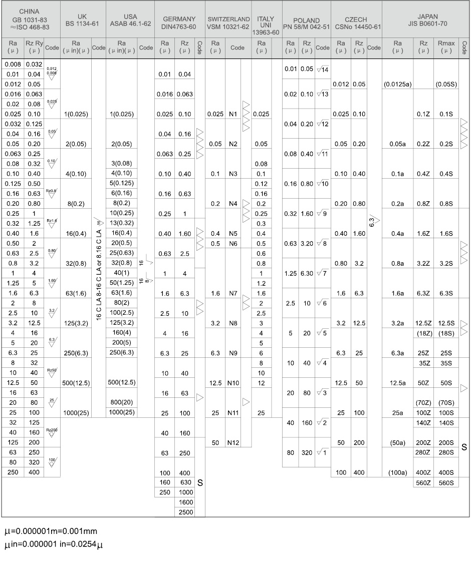 Surface roughness comparison table